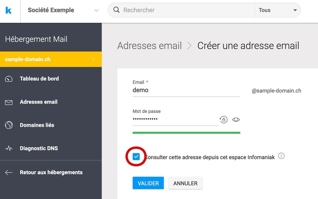 Indiquez le nom d’utilisateur et le mot de passe souhaités, puis validez en cochant la case pour vérifier l’adresse dans l’espace Infomaniak.