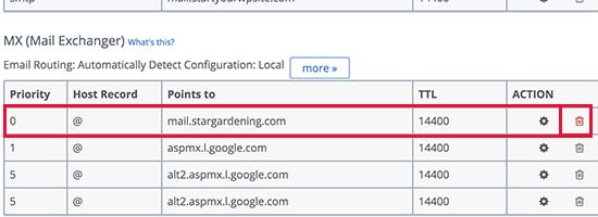 Dans l’éditeur DNS, identifiez l’ancien enregistrement MX et supprimez-le.