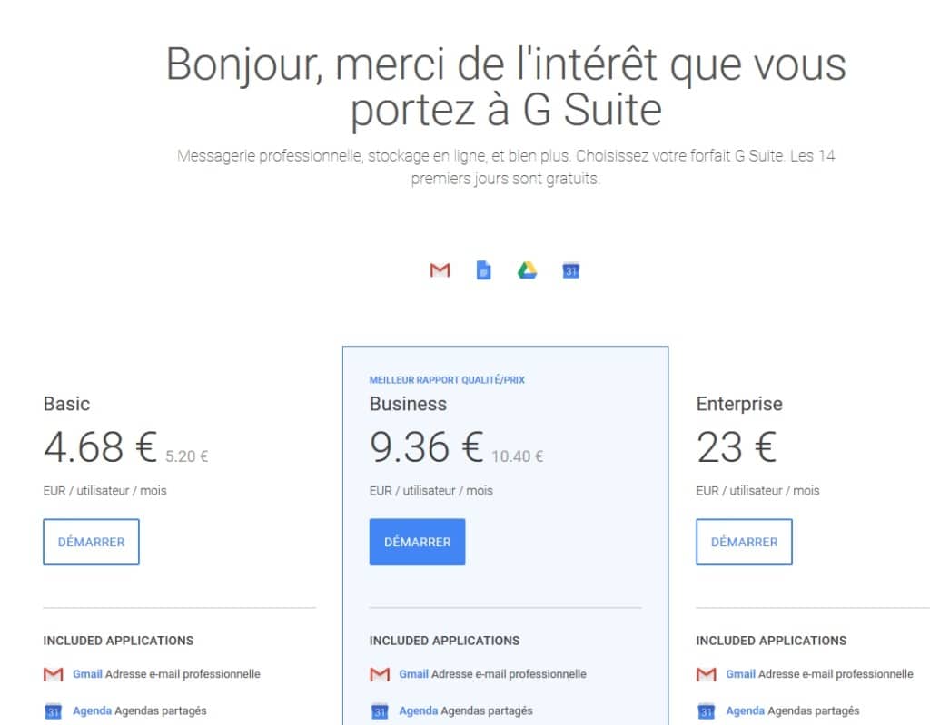 Le forfait de base démarre à 4,62 € par utilisateur et par mois, incluant Gmail, Docs, Drive, Agenda et 30 Go de stockage cloud par utilisateur.