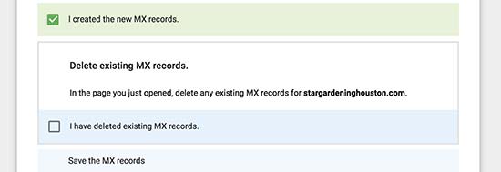 Retournez sur Gsuite et cochez la case confirmant la suppression des anciens MX.
