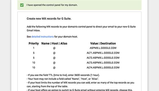 Ouvrez l’éditeur de zone DNS. Dans l’interface Gsuite, cochez la case « J’ai ouvert mon panneau de contrôle de nom de domaine ».