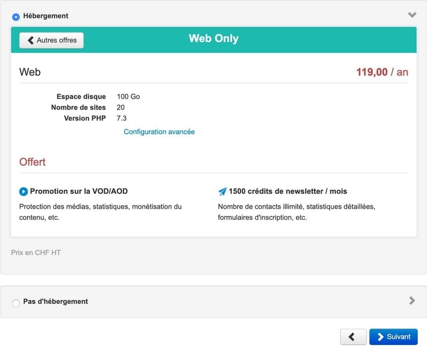Des options complémentaires sont proposées, mais il est judicieux de ne pas les sélectionner d’emblée. Elles restent accessibles ultérieurement depuis votre espace client.