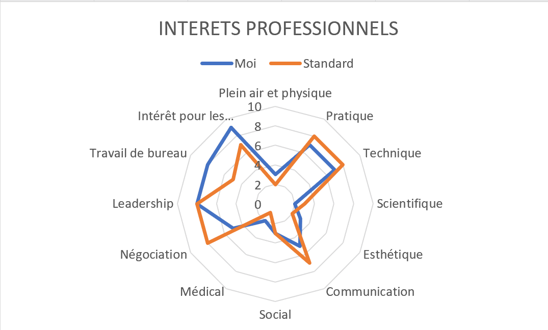Ici, il s’agit de lister les secteurs ou missions qui vous attirent le plus. Un référentiel est proposé mais vous pouvez l’adapter selon vos propres envies. Attribuez à chaque élément une note de 1 à 10. Un simple graphique radar résume la cartographie de vos intérêts, de façon visuelle et rapide.
