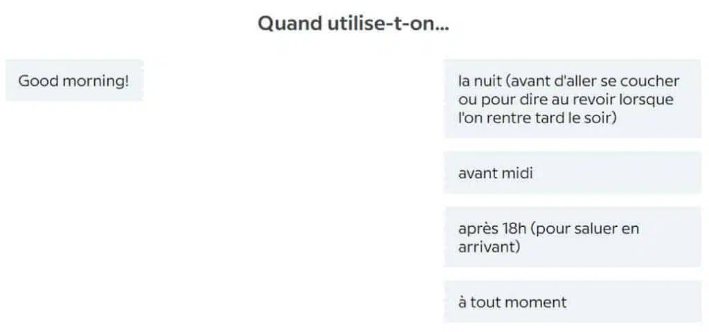 « Grâce à nos cours, vous apprendrez par la pratique. Nos cours consistent en de courts cours qui s’intègrent à la vie quotidienne de chacun. La grammaire et le vocabulaire sont enseignés dans des unités axées sur des exercices de situation thématiques tels que « rencontrer quelqu’un », « commander au restaurant », « faire du shopping » ou « partir en voyage ».