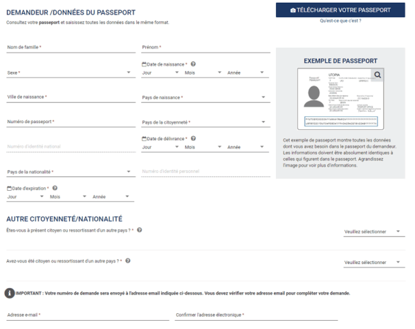 Le site propose désormais de télécharger une photo de la zone MRZ du passeport pour remplir automatiquement certains champs (nom, prénom, date de naissance, numéro de passeport). Cette option n’est pas obligatoire, mais limite les risques d’erreur.