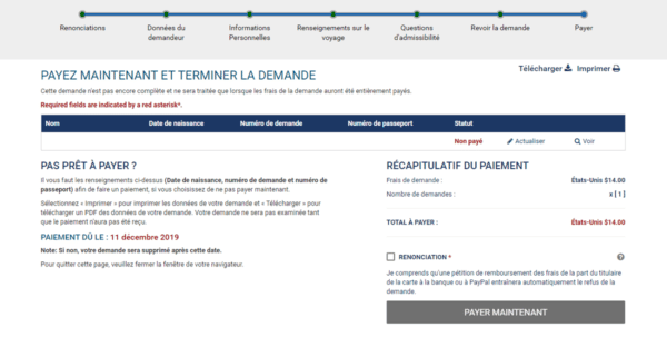 Votre nom, date de naissance et numéro de demande s’affichent. Notez-les soigneusement : ils vous permettront de récupérer votre dossier sur le site officiel (avec le numéro de passeport, cela fonctionne aussi). Le paiement s’effectue en ligne, 14 $ à régler pour valider la demande.